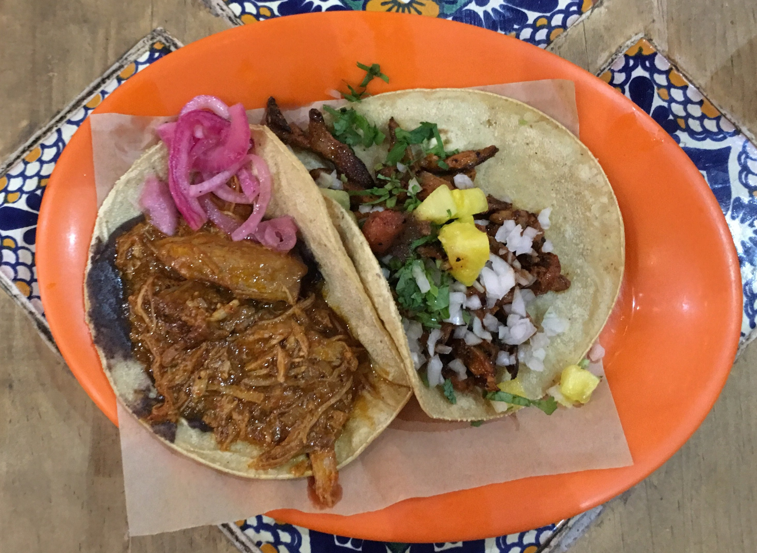 Outside of sit-down dining is where the street vendors dominate. This is where I became an al pastor addict. Taquerías are part of the experience to be frank. It starts with the aromas of grilled vegetables and meat, scouting out which garnishes and salsas to try (pineapples, onions, radishes – so many decisions!), and seeing the hand-made tortilla bake in front of you (sometimes blue, sometimes green). When it comes to salsa and dressings, Mexican mild is not USA mild so proceed with caution.